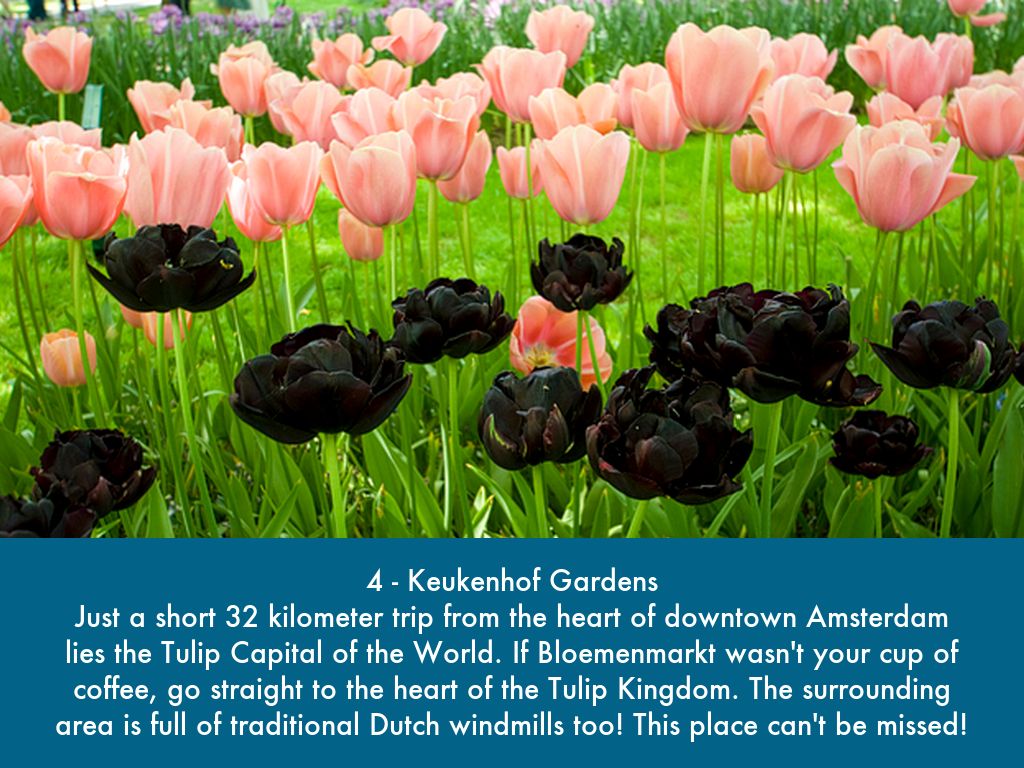 Just a short 32 kilometer trip from the heart of downtown Amsterdam lies the Tulip Capital of the World. If Bloemenmarkt wasn't your cup of coffee, go straight to the heart of the Tulip Kingdom. The surrounding area is full of traditional Dutch windmills too! This place can't be missed!