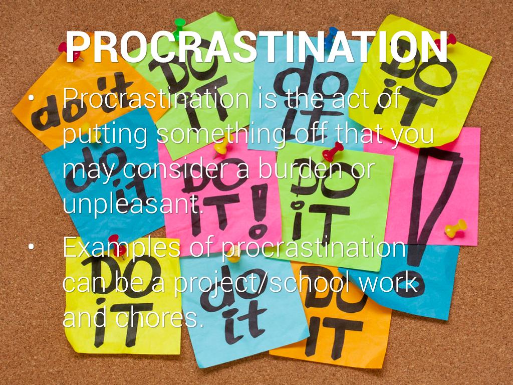 Procrastination is the act of putting something off that you may consider a burden or unpleasant.
