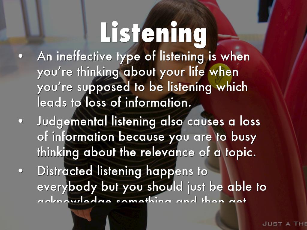An ineffective type of listening is when you’re thinking about your life when you’re supposed to be listening which leads to loss of information.