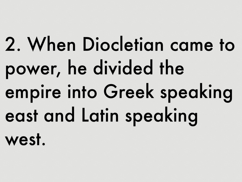2. When Diocletian came to power, he divided the empire into Greek speaking east and Latin speaking west. This division worked for awhile but it created less unity between Rome. After the death of Constantine the east continued to prosper but the west crumpled because of invasions. Because they were divided they didn't protect each other. Soon later invasions from the Visigoths, Huns, and vandals ultimately led to the complete fall of Rome. This is number 2 because this is when the fall actually happened and there were events leading up to this.
