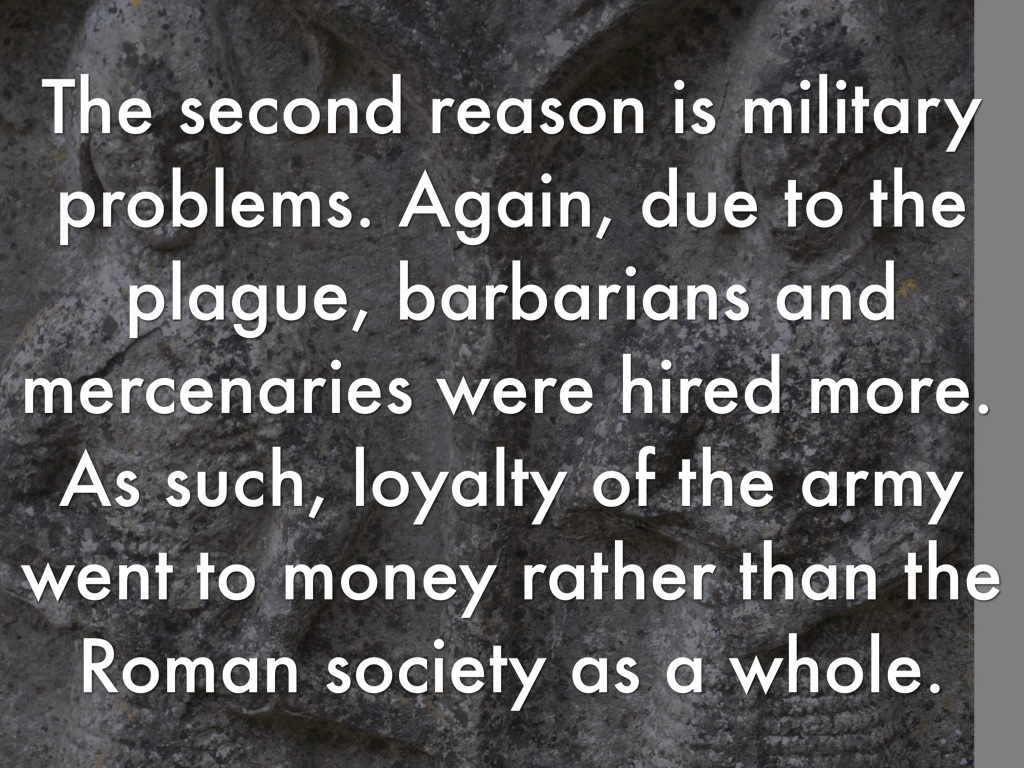 The second reason is military problems. Again, due to the plague, barbarians and mercenaries were hired more. As such, loyalty of the army went to money rather than the Roman society as a whole.
