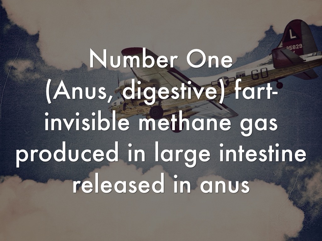 (Anus, digestive) fart- invisible methane gas produced in large intestine released in anus