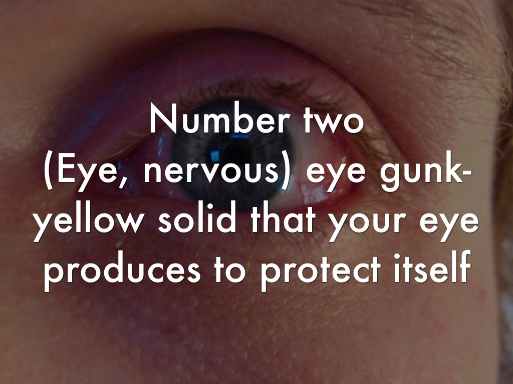 (Eye, nervous) eye gunk- yellow solid that your eye produces to protect itself