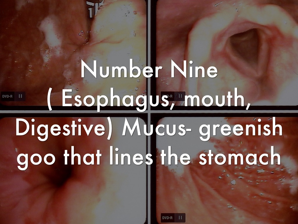 ( Esophagus, mouth, Digestive) Mucus- greenish goo that lines the stomach