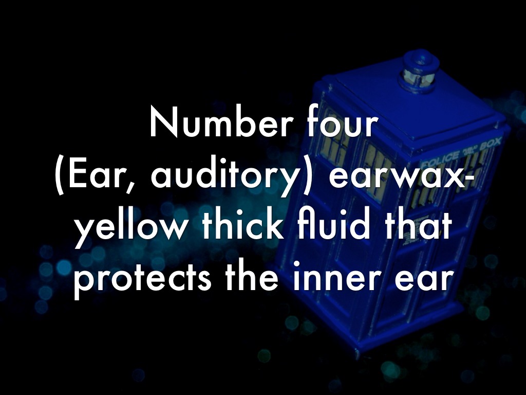 (Ear, auditory) earwax- yellow thick fluid that protects the inner ear
