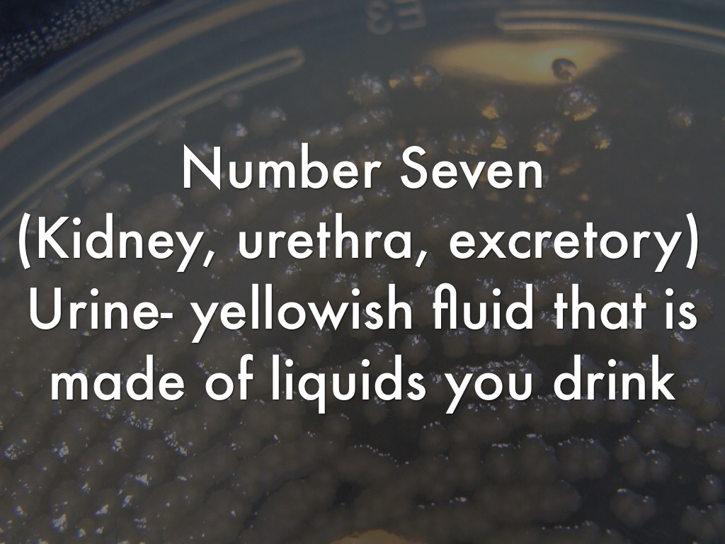 (Kidney, urethra, excretory) Urine- yellowish fluid that is made of liquids you drink