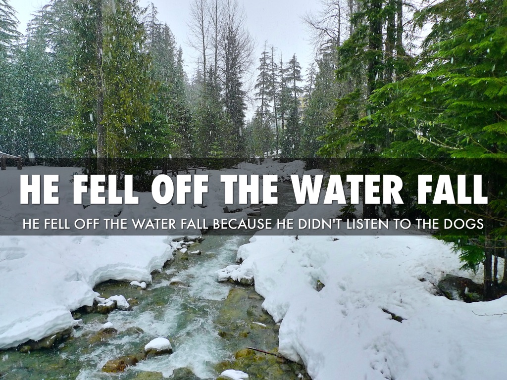 HE FELL OFF THE WATER FALL BECAUSE HE DIDN'T LISTEN TO THE DOGS