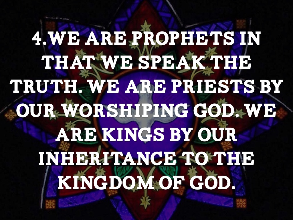 4.We are prophets in that we speak the truth. We are priests by our worshiping god. we are kings by our inheritance to the kingdom of god.