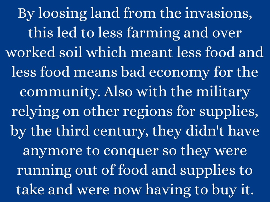 By loosing land from the invasions, this led to less farming and over worked soil which meant less food and less food means bad economy for the community. Also with the military relying on other regions for supplies, by the third century, they didn't have anymore to conquer so they were running out of food and supplies to take and were now having to buy it.