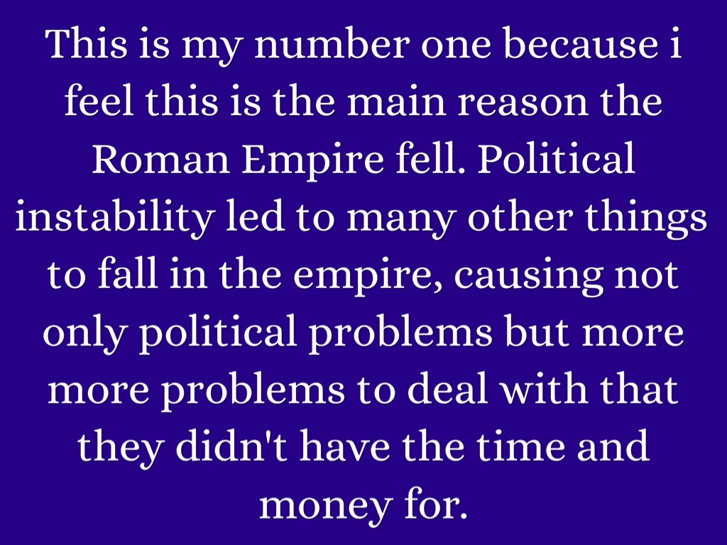 This is my number one because i feel this is the main reason the Roman Empire fell. Political instability led to many other things to fall in the empire, causing not only political problems but more more problems to deal with that they didn't have the time and money for.