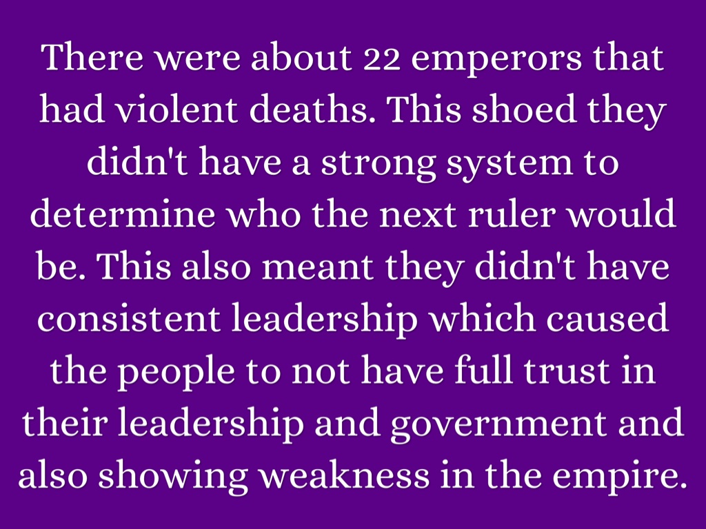 There were about 22 emperors that had violent deaths. This shoed they didn't have a strong system to determine who the next ruler would be. This also meant they didn't have consistent leadership which caused the people to not have full trust in their leadership and government and also showing weakness in the empire.