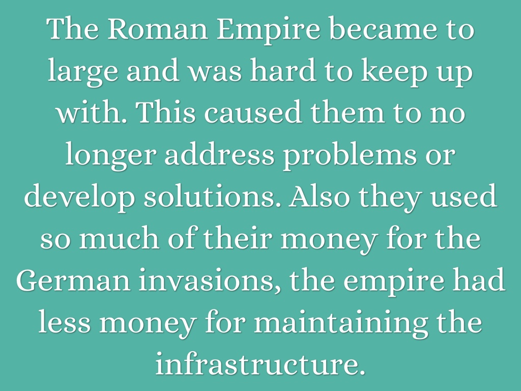 The Roman Empire became to large and was hard to keep up with. This caused them to no longer address problems or develop solutions. Also they used so much of their money for the German invasions, the empire had less money for maintaining the infrastructure.