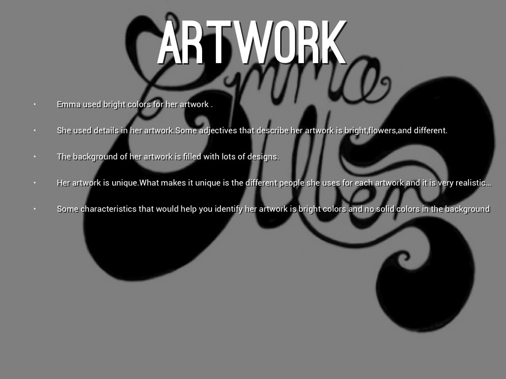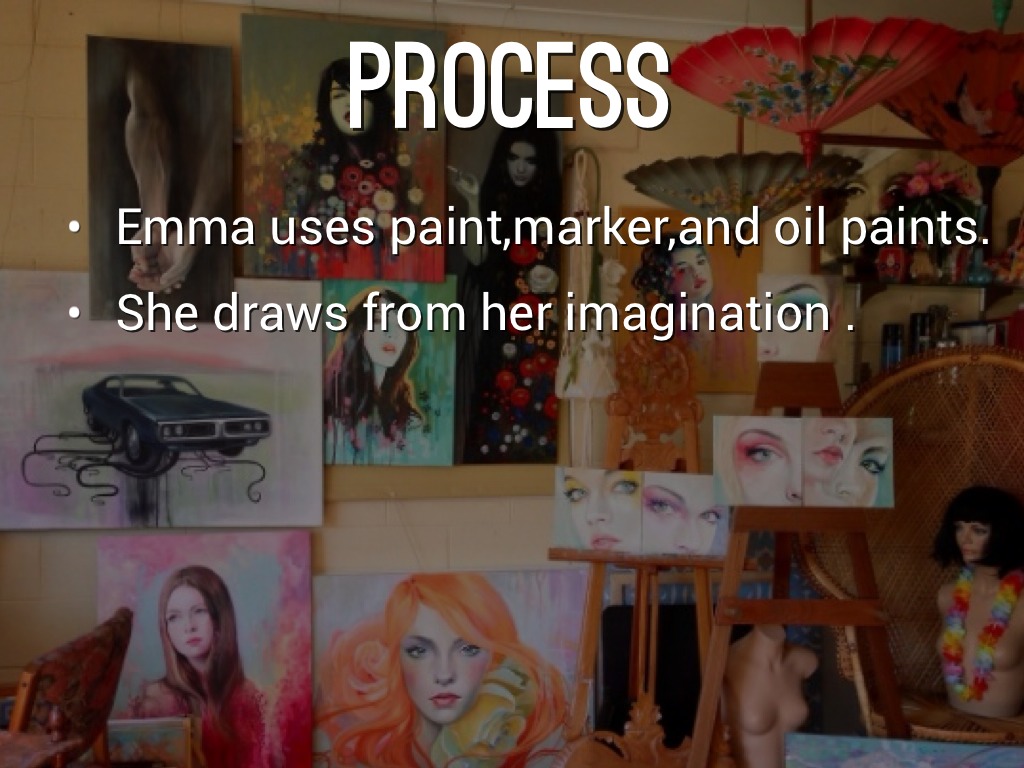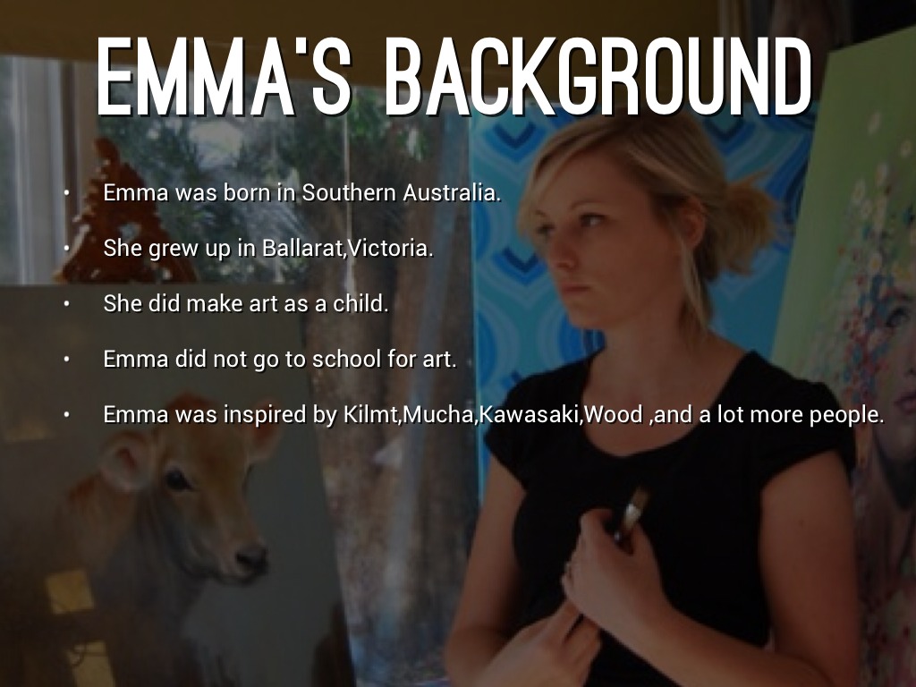 Emma was inspired by Kilmt,Mucha,Kawasaki,Wood ,and a lot more people.