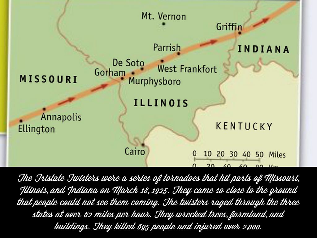 The Tristate Twisters were a series of tornadoes that hit parts of Missouri, Illinois, and Indiana on March 18, 1925. They came so close to the ground that people could not see them coming. The twisters raged through the three states at over 62 miles per hour. They wrecked trees, farmland, and buildings. They killed 695 people and injured over 2,000.