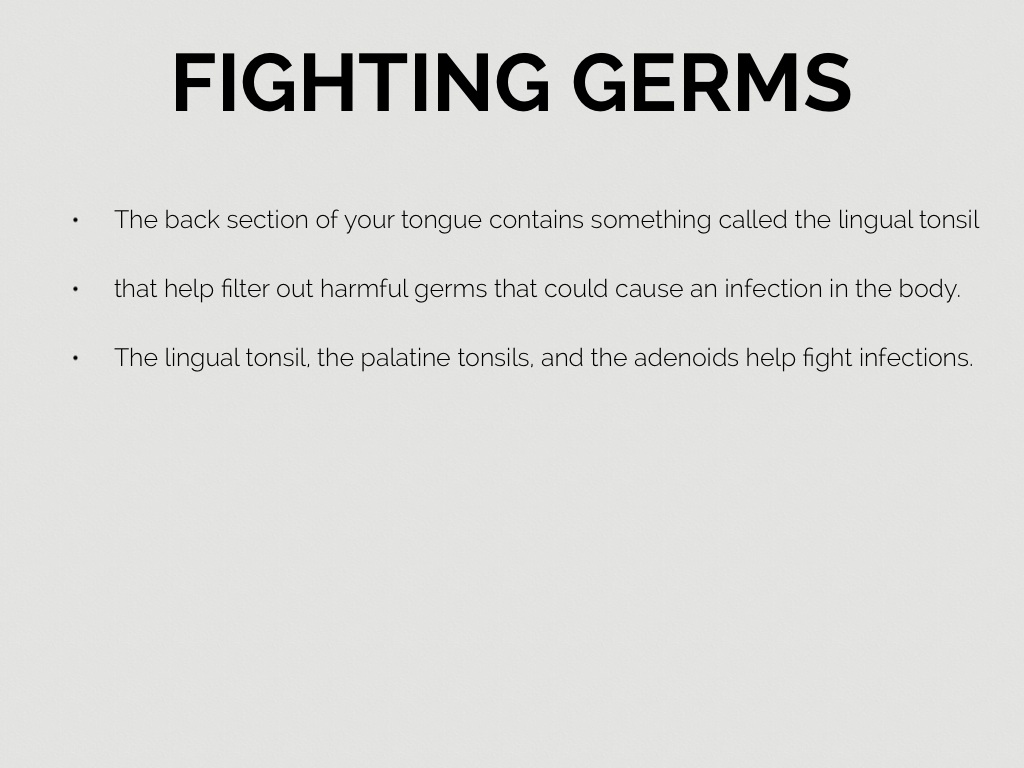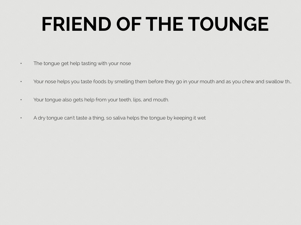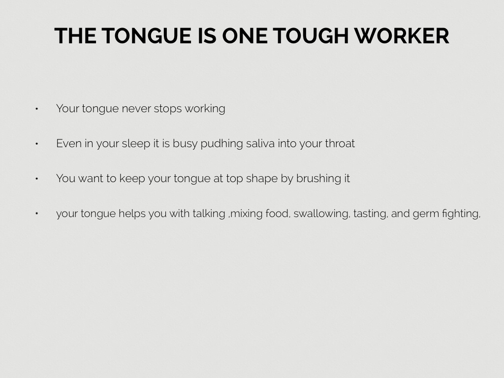 • your tongue helps you with talking ,mixing food, swallowing, tasting, and germ fighting,