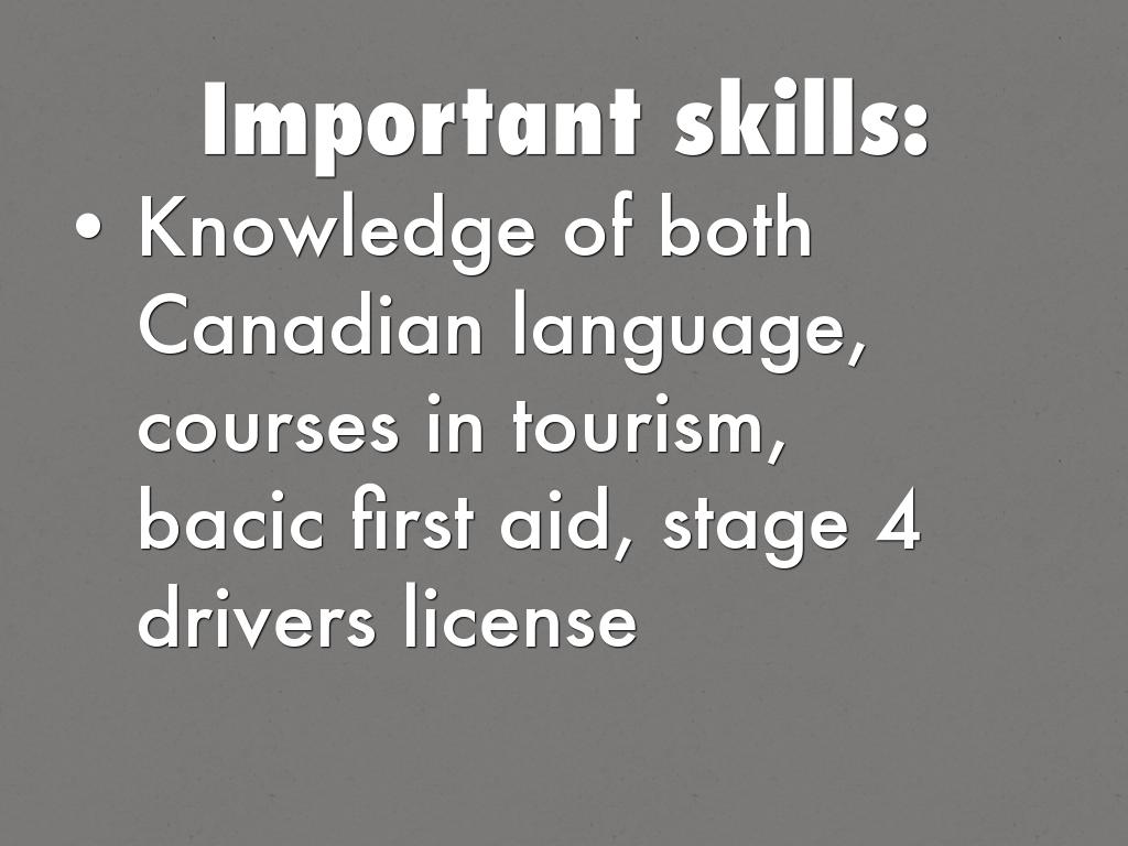 Knowledge of both Canadian language, courses in tourism, bacic first aid, stage 4 drivers license