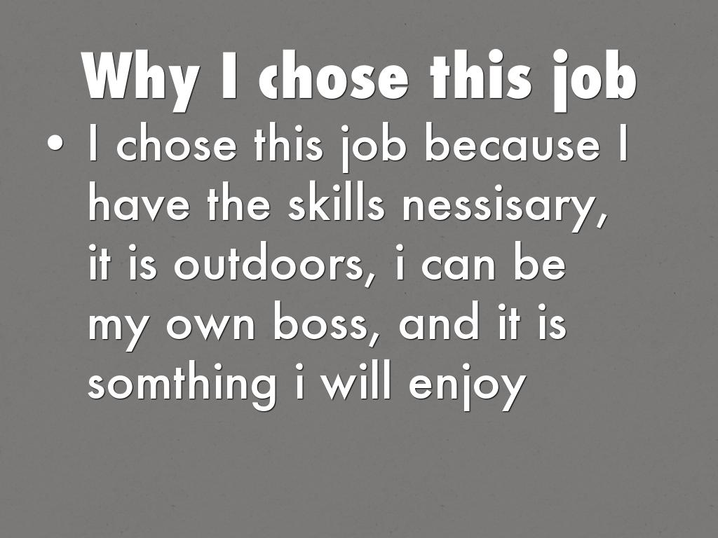 I chose this job because I have the skills nessisary, it is outdoors, i can be my own boss, and it is somthing i will enjoy