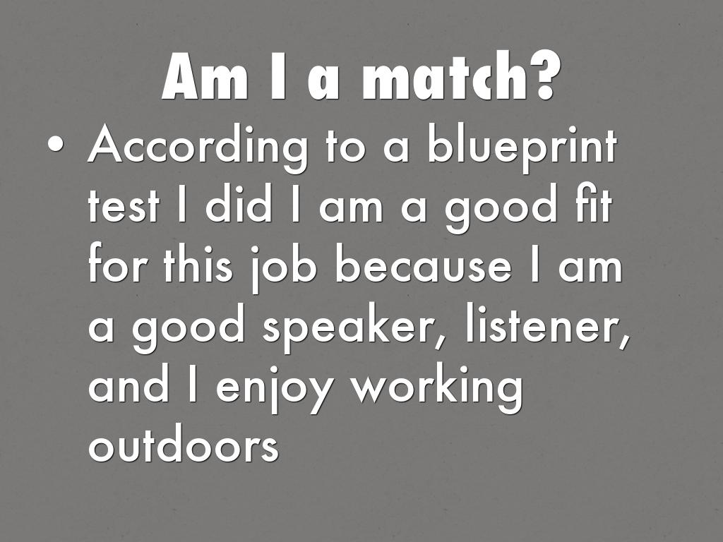 According to a blueprint test I did I am a good fit for this job because I am a good speaker, listener, and I enjoy working outdoors