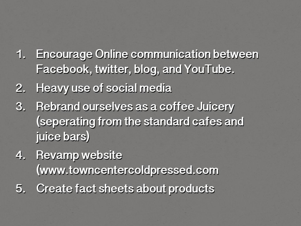 - Encourage Online communication between Facebook, twitter, blog, and YouTube.