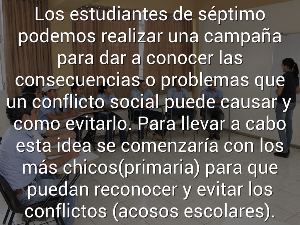 Los estudiantes de séptimo podemos realizar una campaña para dar a conocer las consecuencias o problemas que un conflicto social puede causar y como evitarlo. Para llevar a cabo esta idea se comenzaría con los más chicos(primaria) para que puedan reconocer y evitar los conflictos (acosos escolares).