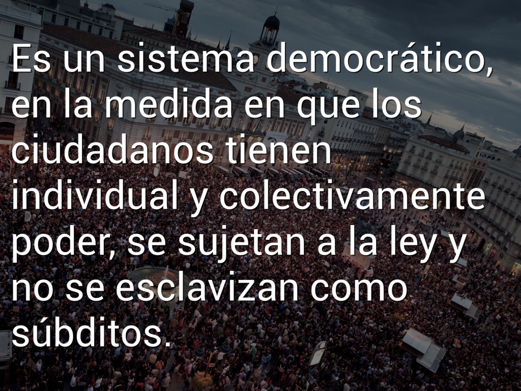 Es un sistema democrático, en la medida en que los ciudadanos tienen individual y colectivamente poder, se sujetan a la ley y no se esclavizan como súbditos.