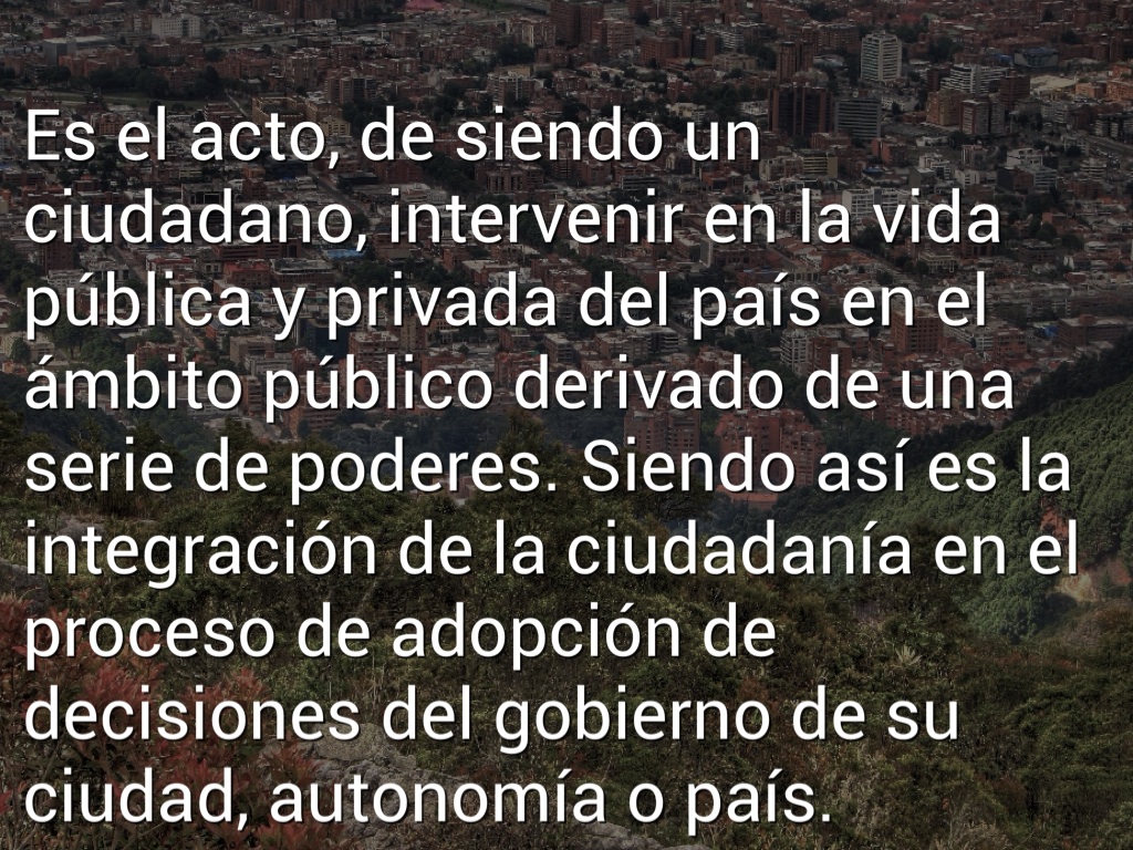 Es el acto, de siendo un ciudadano, intervenir en la vida pública y privada del país en el ámbito público derivado de una serie de poderes. Siendo así es la integración de la ciudadanía en el proceso de adopción de decisiones del gobierno de su ciudad, autonomía o país.