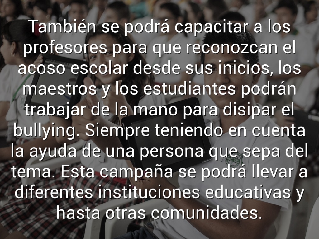 También se podrá capacitar a los profesores para que reconozcan el acoso escolar desde sus inicios, los maestros y los estudiantes podrán trabajar de la mano para disipar el bullying. Siempre teniendo en cuenta la ayuda de una persona que sepa del tema. Esta campaña se podrá llevar a diferentes instituciones educativas y hasta otras comunidades.