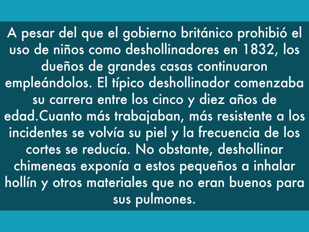 A pesar del que el gobierno británico prohibió el uso de niños como deshollinadores en 1832, los dueños de grandes casas continuaron empleándolos. El típico deshollinador comenzaba su carrera entre los cinco y diez años de edad.Cuanto más trabajaban, más resistente a los incidentes se volvía su piel y la frecuencia de los cortes se reducía. No obstante, deshollinar chimeneas exponía a estos pequeños a inhalar hollín y otros materiales que no eran buenos para sus pulmones.