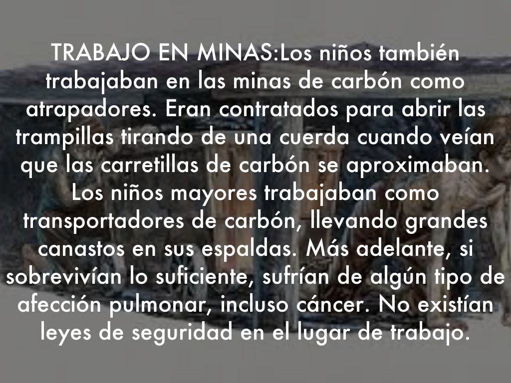 TRABAJO EN MINAS:Los niños también trabajaban en las minas de carbón como atrapadores. Eran contratados para abrir las trampillas tirando de una cuerda cuando veían que las carretillas de carbón se aproximaban. Los niños mayores trabajaban como transportadores de carbón, llevando grandes canastos en sus espaldas. Más adelante, si sobrevivían lo suficiente, sufrían de algún tipo de afección pulmonar, incluso cáncer. No existían leyes de seguridad en el lugar de trabajo.