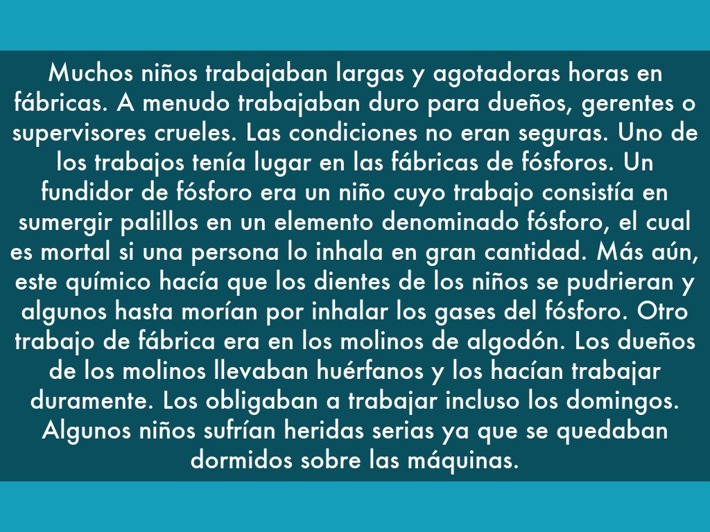 Muchos niños trabajaban largas y agotadoras horas en fábricas. A menudo trabajaban duro para dueños, gerentes o supervisores crueles. Las condiciones no eran seguras. Uno de los trabajos tenía lugar en las fábricas de fósforos. Un fundidor de fósforo era un niño cuyo trabajo consistía en sumergir palillos en un elemento denominado fósforo, el cual es mortal si una persona lo inhala en gran cantidad. Más aún, este químico hacía que los dientes de los niños se pudrieran y algunos hasta morían por inhalar los gases del fósforo. Otro trabajo de fábrica era en los molinos de algodón. Los dueños de los molinos llevaban huérfanos y los hacían trabajar duramente. Los obligaban a trabajar incluso los domingos. Algunos niños sufrían heridas serias ya que se quedaban dormidos sobre las máquinas.