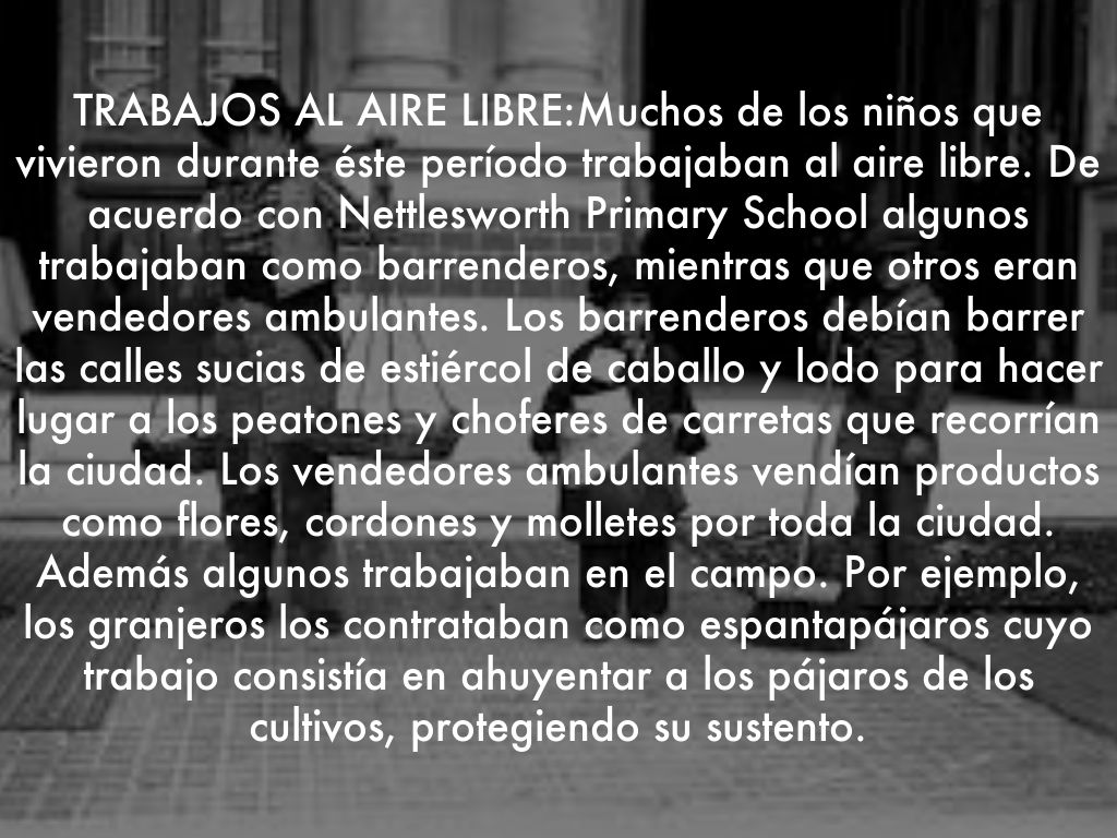 TRABAJOS AL AIRE LIBRE:Muchos de los niños que vivieron durante éste período trabajaban al aire libre. De acuerdo con Nettlesworth Primary School algunos trabajaban como barrenderos, mientras que otros eran vendedores ambulantes. Los barrenderos debían barrer las calles sucias de estiércol de caballo y lodo para hacer lugar a los peatones y choferes de carretas que recorrían la ciudad. Los vendedores ambulantes vendían productos como flores, cordones y molletes por toda la ciudad. Además algunos trabajaban en el campo. Por ejemplo, los granjeros los contrataban como espantapájaros cuyo trabajo consistía en ahuyentar a los pájaros de los cultivos, protegiendo su sustento.