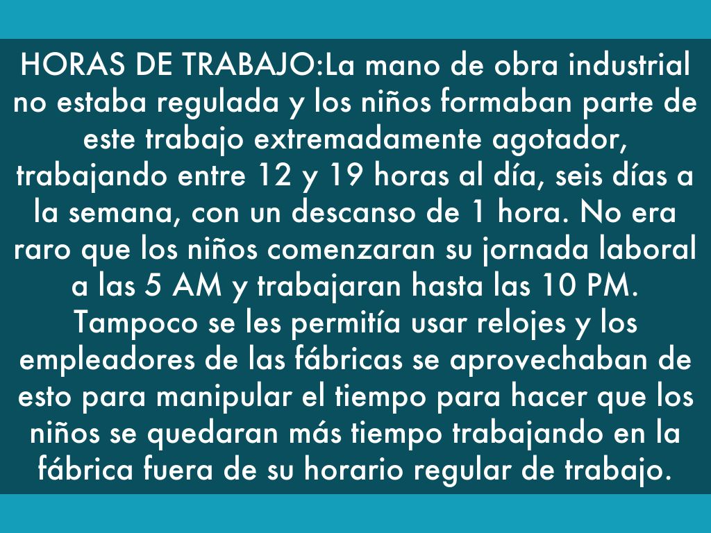 HORAS DE TRABAJO:La mano de obra industrial no estaba regulada y los niños formaban parte de este trabajo extremadamente agotador, trabajando entre 12 y 19 horas al día, seis días a la semana, con un descanso de 1 hora. No era raro que los niños comenzaran su jornada laboral a las 5 AM y trabajaran hasta las 10 PM. Tampoco se les permitía usar relojes y los empleadores de las fábricas se aprovechaban de esto para manipular el tiempo para hacer que los niños se quedaran más tiempo trabajando en la fábrica fuera de su horario regular de trabajo.