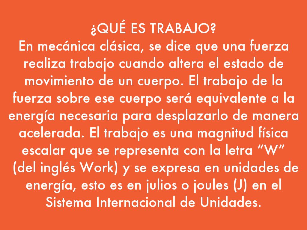 En mecánica clásica, se dice que una fuerza realiza trabajo cuando altera el estado de movimiento de un cuerpo. El trabajo de la fuerza sobre ese cuerpo será equivalente a la energía necesaria para desplazarlo de manera acelerada. El trabajo es una magnitud física escalar que se representa con la letra “W”