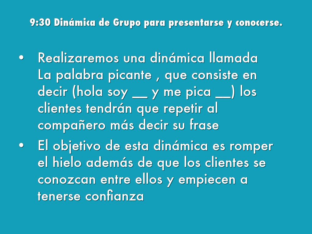 Realizaremos una dinámica llamada La palabra picante , que consiste en decir (hola soy __ y me pica __) los clientes tendrán que repetir al compañero más decir su frase