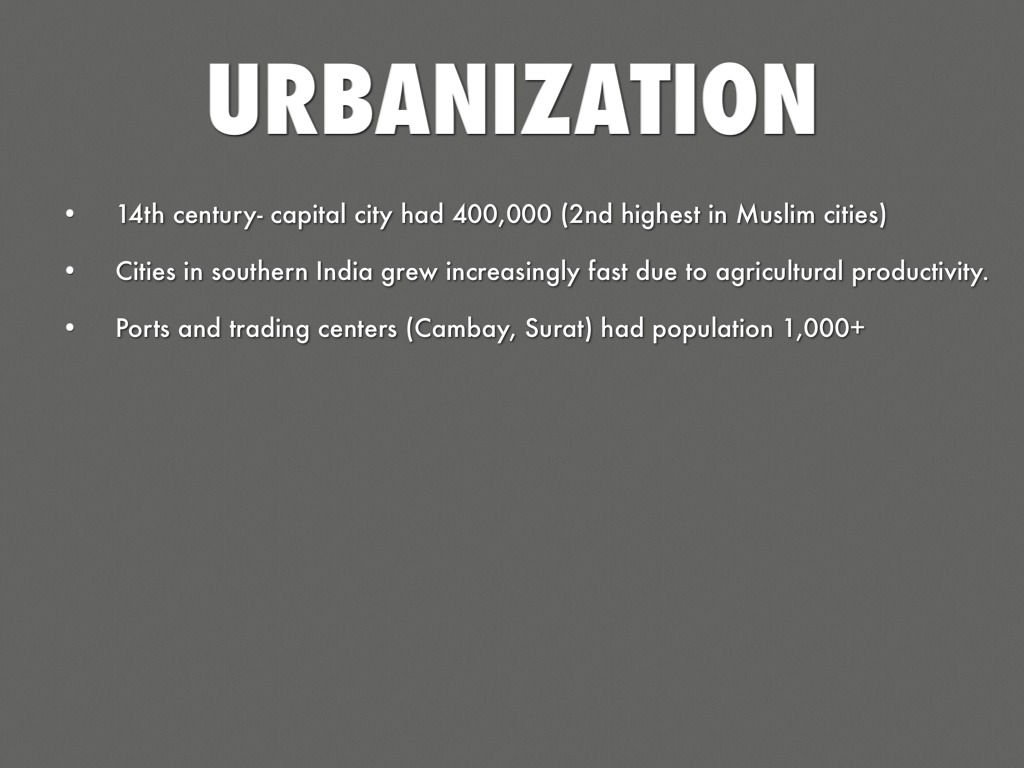 - Ports and trading centers (Cambay, Surat) had population 1,000+