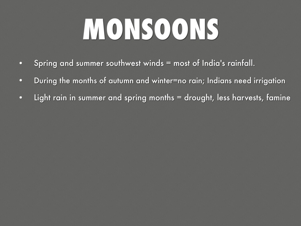 - During the months of autumn and winter=no rain; Indians need irrigation