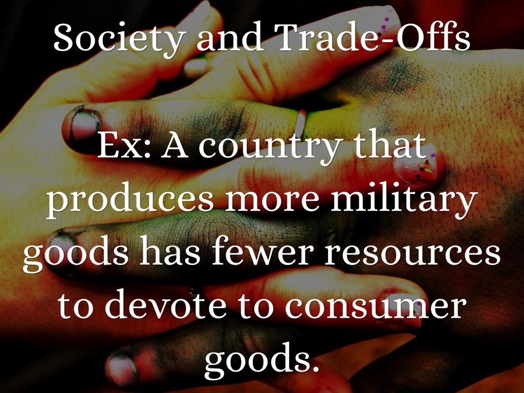 Ex: A country that produces more military goods has fewer resources to devote to consumer goods.