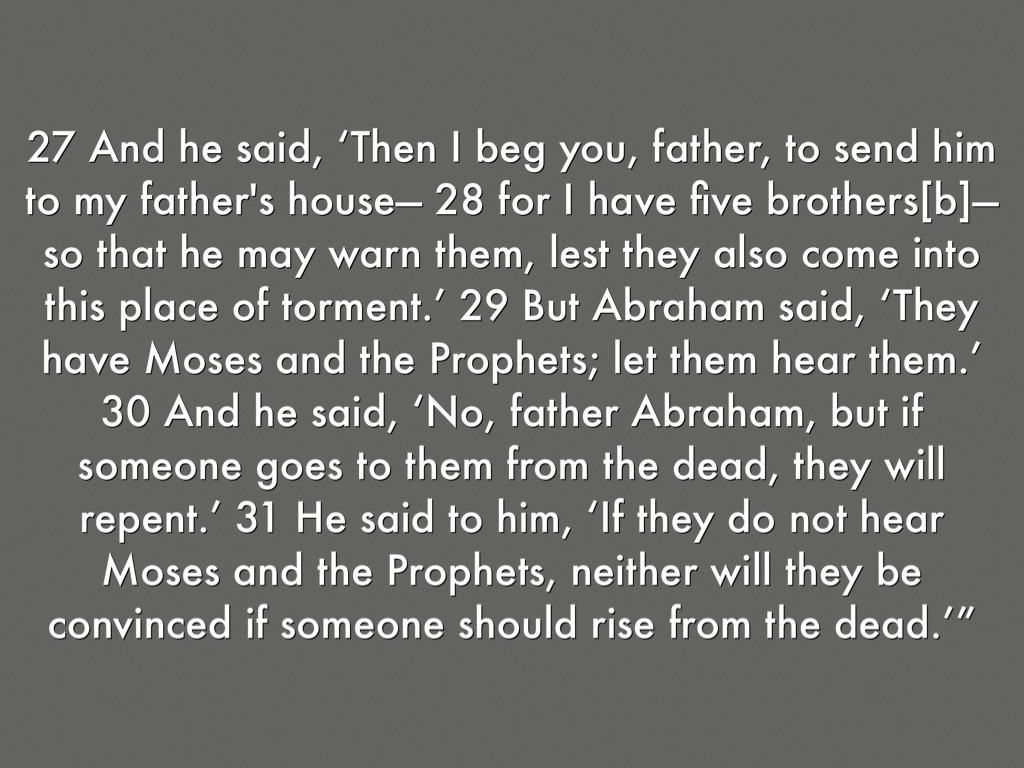 27 And he said, ‘Then I beg you, father, to send him to my father's house— 28 for I have five brothers[b]—so that he may warn them, lest they also come into this place of torment.’ 29 But Abraham said, ‘They have Moses and the Prophets; let them hear them.’ 30 And he said, ‘No, father Abraham, but if someone goes to them from the dead, they will repent.’ 31 He said to him, ‘If they do not hear Moses and the Prophets, neither will they be convinced if someone should rise from the dead.’”