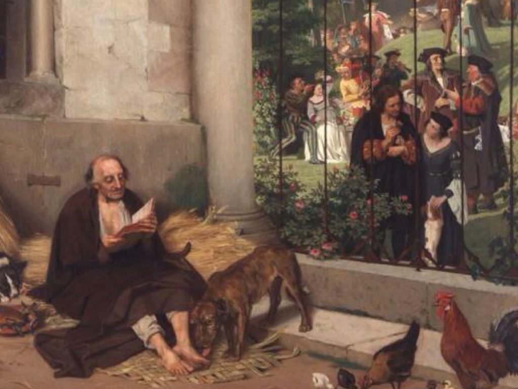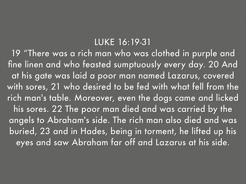 19 “There was a rich man who was clothed in purple and fine linen and who feasted sumptuously every day. 20 And at his gate was laid a poor man named Lazarus, covered with sores, 21 who desired to be fed with what fell from the rich man's table. Moreover, even the dogs came and licked his sores. 22 The poor man died and was carried by the angels to Abraham's side. The rich man also died and was buried, 23 and in Hades, being in torment, he lifted up his eyes and saw Abraham far off and Lazarus at his side.