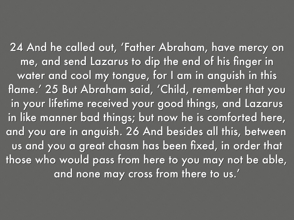 24 And he called out, ‘Father Abraham, have mercy on me, and send Lazarus to dip the end of his finger in water and cool my tongue, for I am in anguish in this flame.’ 25 But Abraham said, ‘Child, remember that you in your lifetime received your good things, and Lazarus in like manner bad things; but now he is comforted here, and you are in anguish. 26 And besides all this, between us and you a great chasm has been fixed, in order that those who would pass from here to you may not be able, and none may cross from there to us.’