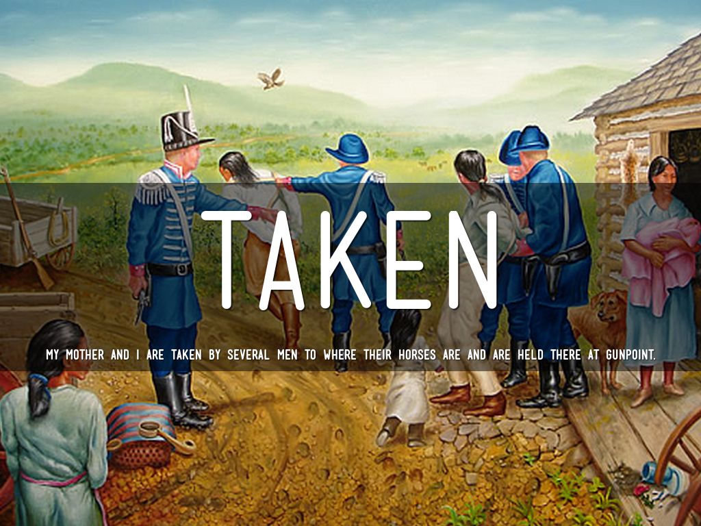 MY MOTHER AND I ARE TAKEN BY SEVERAL MEN TO WHERE THEIR HORSES ARE AND ARE HELD THERE AT GUNPOINT.