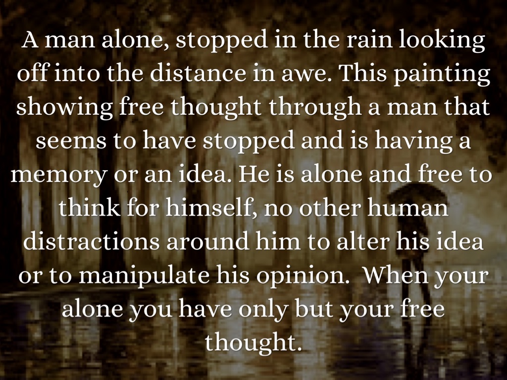 A man alone, stopped in the rain looking off into the distance in awe. This painting showing free thought through a man that seems to have stopped and is having a memory or an idea. He is alone and free to think for himself, no other human distractions around him to alter his idea or to manipulate his opinion. When your alone you have only but your free thought.