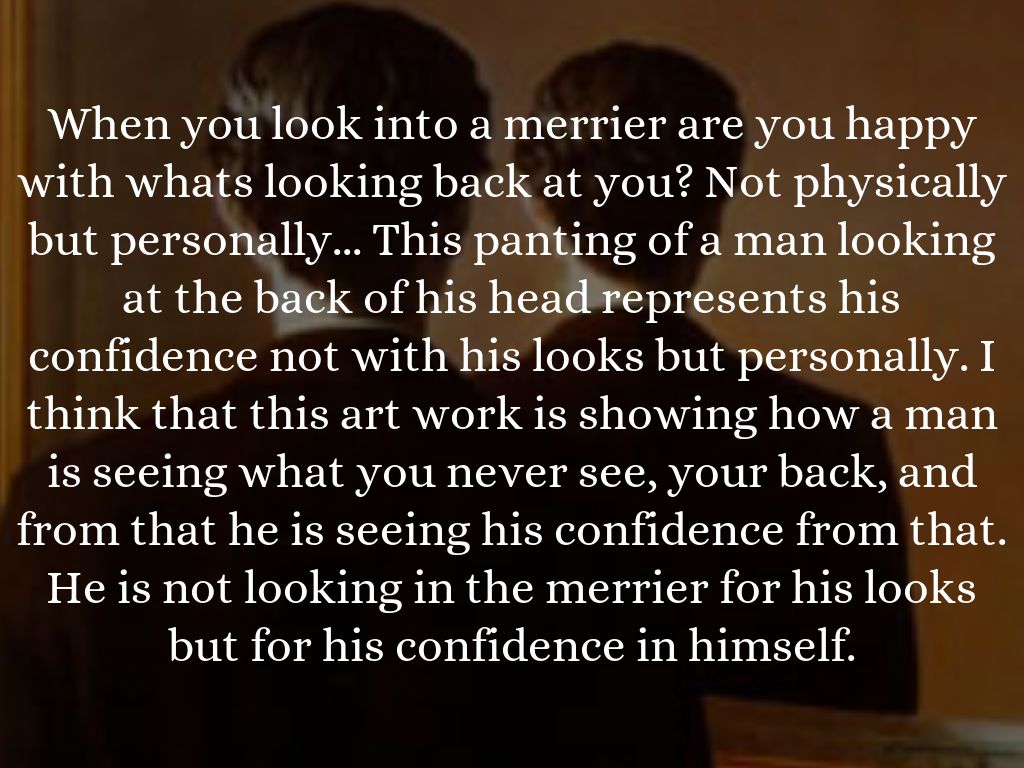When you look into a merrier are you happy with whats looking back at you? Not physically but personally... This panting of a man looking at the back of his head represents his confidence not with his looks but personally. I think that this art work is showing how a man is seeing what you never see, your back, and from that he is seeing his confidence from that. He is not looking in the merrier for his looks but for his confidence in himself.