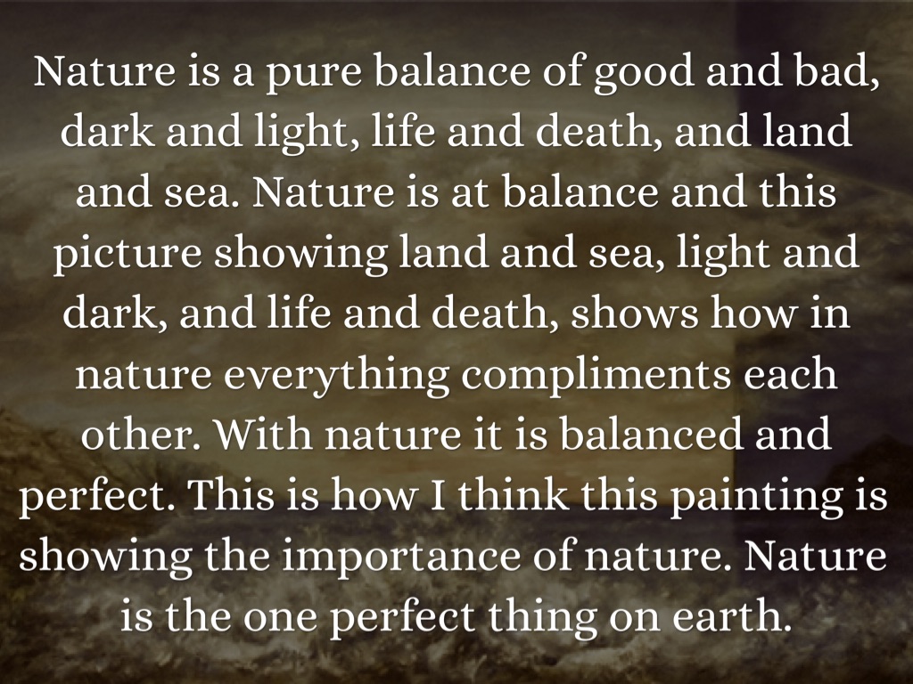 Nature is a pure balance of good and bad, dark and light, life and death, and land and sea. Nature is at balance and this picture showing land and sea, light and dark, and life and death, shows how in nature everything compliments each other. With nature it is balanced and perfect. This is how I think this painting is showing the importance of nature. Nature is the one perfect thing on earth.
