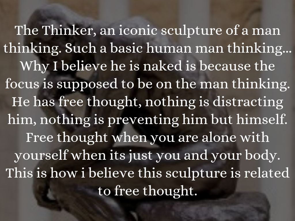 The Thinker, an iconic sculpture of a man thinking. Such a basic human man thinking... Why I believe he is naked is because the focus is supposed to be on the man thinking. He has free thought, nothing is distracting him, nothing is preventing him but himself. Free thought when you are alone with yourself when its just you and your body. This is how i believe this sculpture is related to free thought.