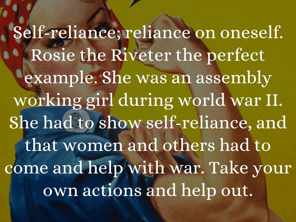 Self-reliance; reliance on oneself. Rosie the Riveter the perfect example. She was an assembly working girl during world war II. She had to show self-reliance, and that women and others had to come and help with war. Take your own actions and help out.