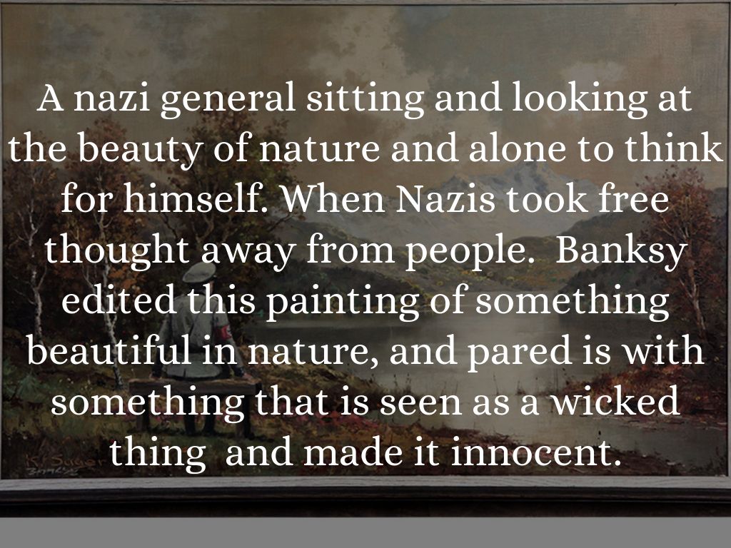A nazi general sitting and looking at the beauty of nature and alone to think for himself. When Nazis took free thought away from people. Banksy edited this painting of something beautiful in nature, and pared is with something that is seen as a wicked thing and made it innocent.