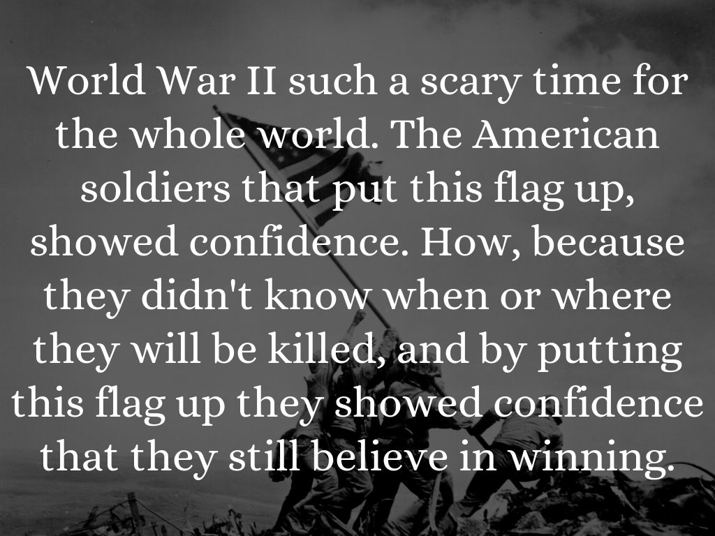 World War II such a scary time for the whole world. The American soldiers that put this flag up, showed confidence. How, because they didn't know when or where they will be killed, and by putting this flag up they showed confidence that they still believe in winning.