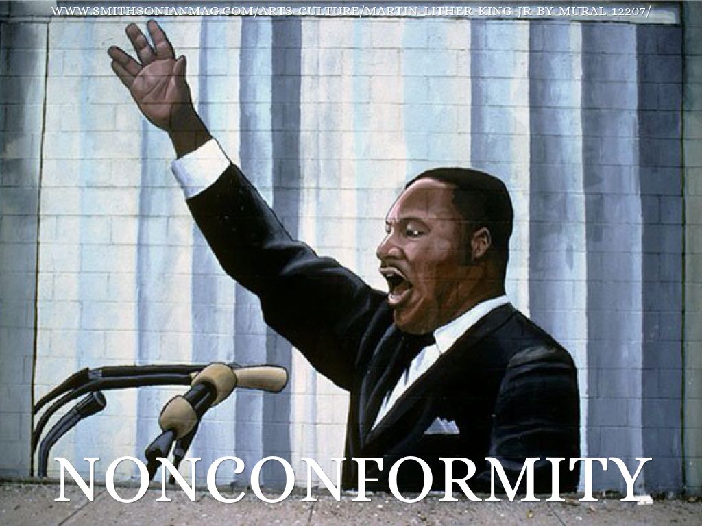 This picture incorporates nonconformity. MLK a historical icon for the civil rights movement. He stood up for equality of every man, black or white all equal. Going against society and standing up in what he believed in MLK a perfect example of nonconformity.