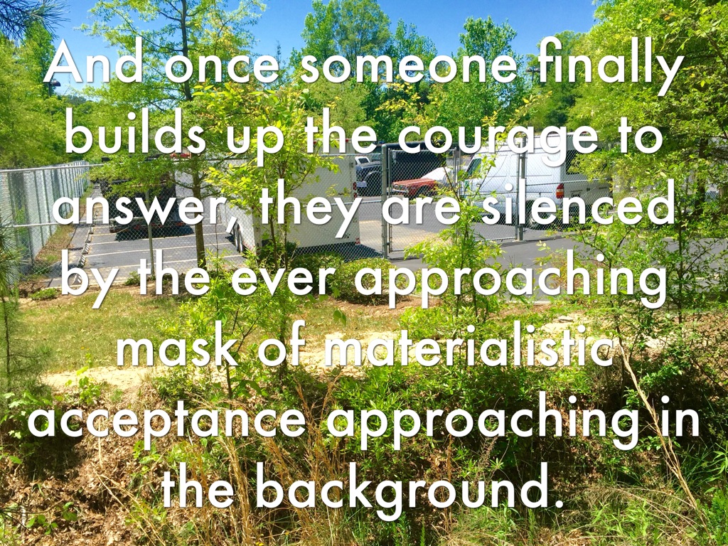 And once someone finally builds up the courage to answer, they are silenced by the ever approaching mask of materialistic acceptance approaching in the background.